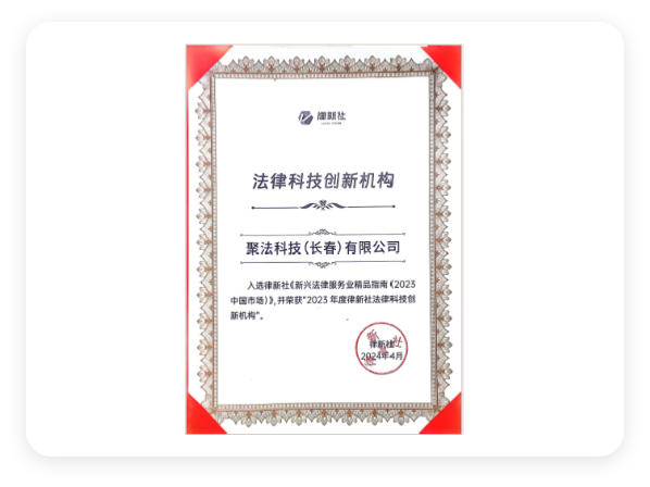 2024年4月,入選律新社《新興法律服務(wù)業(yè)精品指南(2023中國市場)》,并榮獲“2023年度法律科技創(chuàng)新機構(gòu)”。