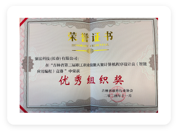 2024年11月,榮獲吉林省第三屆職工職業(yè)技能大賽計算機程序設(shè)計員優(yōu)秀組織獎。