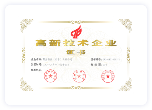 聚法科技榮獲吉林省“科技小巨人企業(yè)”稱號。被吉林省科技廳認定為“高新技術(shù)企業(yè)”。